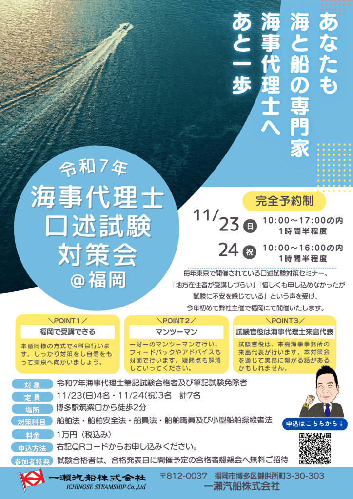 この度、弊社主催で福岡において「海事代理士試験口述試験対策会」を開催することになりました。