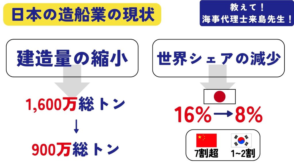 建造量は、2019年の1,600万総トンから2024年には900万総トンまで落ち込みました。日本船主は竣工年ベースで概ね1,200万総トン前後の船舶を発注していますから、日本船主の発注需要を下回っていることになります。海外の造船所に頼らざるを得ない状況です。