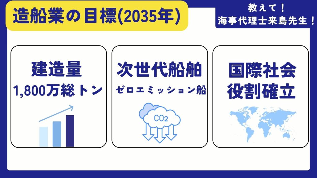 以上を踏まえ、政府が打ち出した2035年造船業の目標は、以下の3つです!