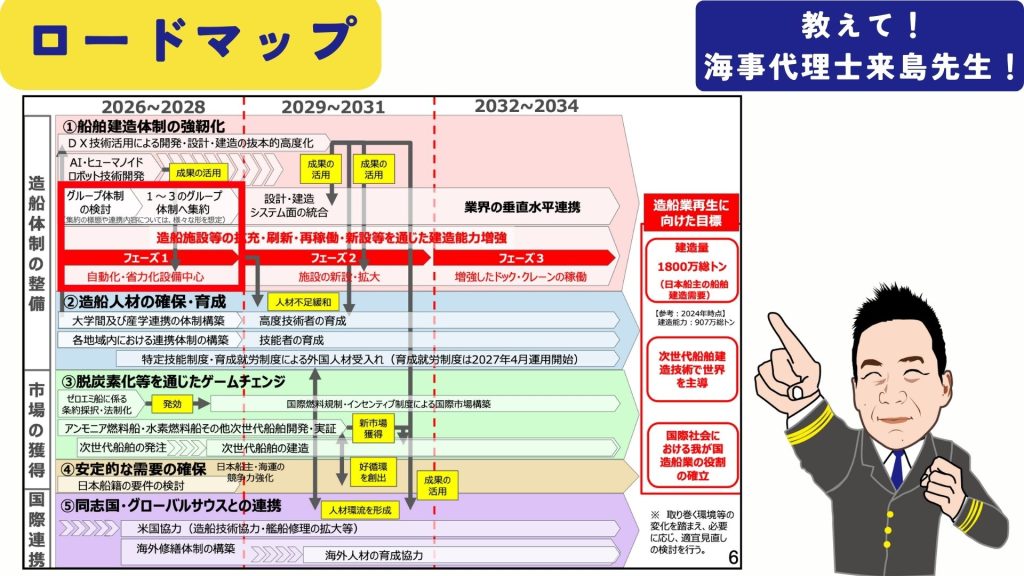 ロードマップにはより詳細な内容が時間軸と共に記載されていますが、最も注目されているのが、船舶建造体制の強靱化において2028年までに造船会社を1〜3のグループに集約するという点です。