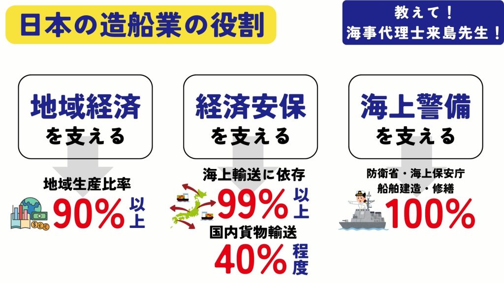 三つ目は、「海上警備」を支えるという点です。防衛省・海上保安庁の船舶の全てを国内で建造・修繕しています。安全保障の観点からも必要な産業といえます。